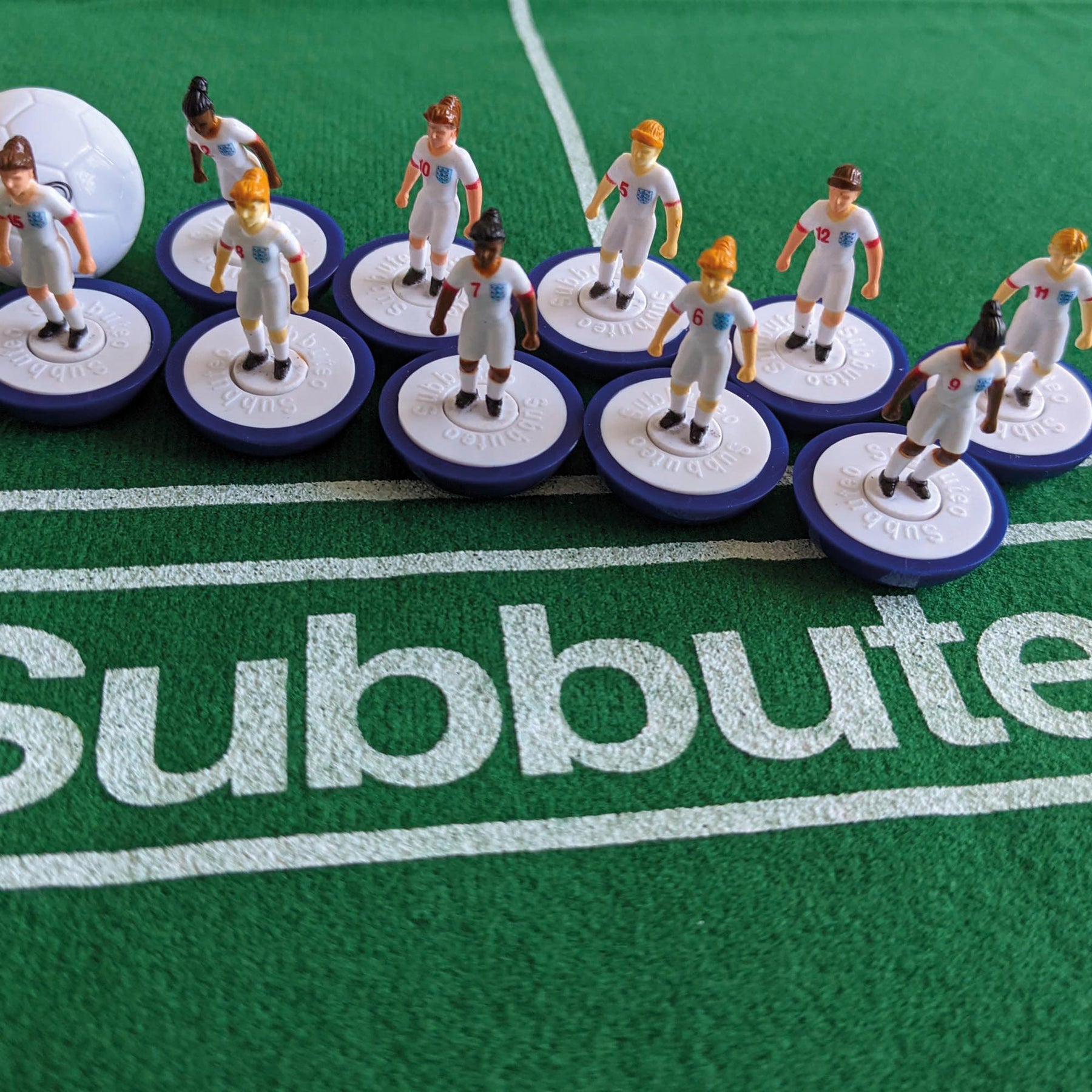 Subbuteo Lionesses Main Game - figurines of England Lionesses players on the pitch.